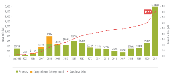 Voluntary Carbon Market Value, pre-2005 to 2021.