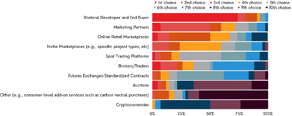 | We’re seeing lots of new entrants offering new ways to trade carbon credits. We asked our Global Carbon Survey respondents how they prefer to buy and sell.The vast majority still prefer bilateral deals between project developers and end buyers. These are advantageous for project developers, who can respond directly to corporate requests for proposals and build a relationship. Project developers also get to shine in retail marketplaces and niche marketplaces (the third and fourth most popular transaction options) that allow for storytelling and rich information about projects. And buyers get to develop a more direct relationship with the project proponents, who may be half a world away.