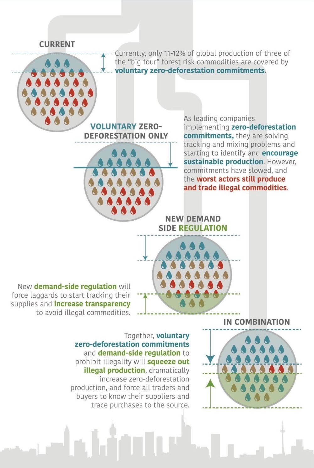 So far, companies have been trying to fight this battle largely alone. But global commodity supply chains are complicated. Importers have had a very, very hard time determining where their purchases originally came from, and whether they are deforestation-free (the ideal), legal but unsustainable, or downright illegal. They have limited ability to get forest countries to enforce environmental protection laws. And while some companies are trying to do the right thing, there will always be laggards willing to deal in cheap, illegally produced commodities if they can get away with it.