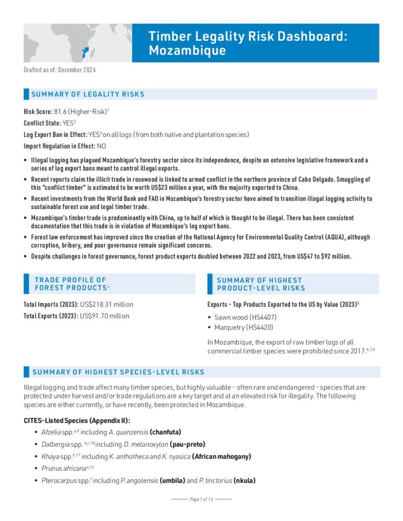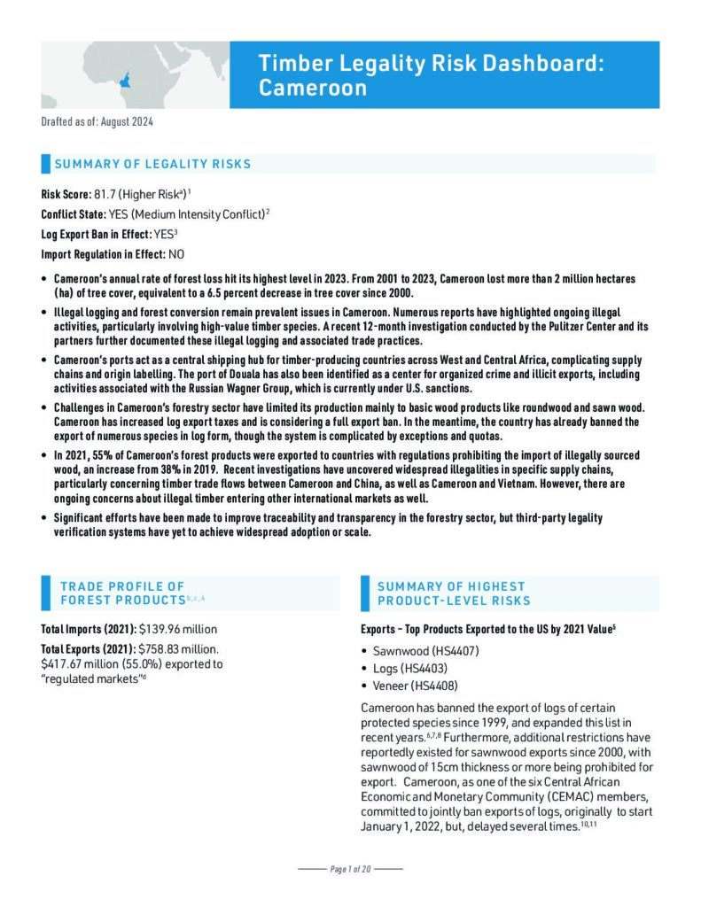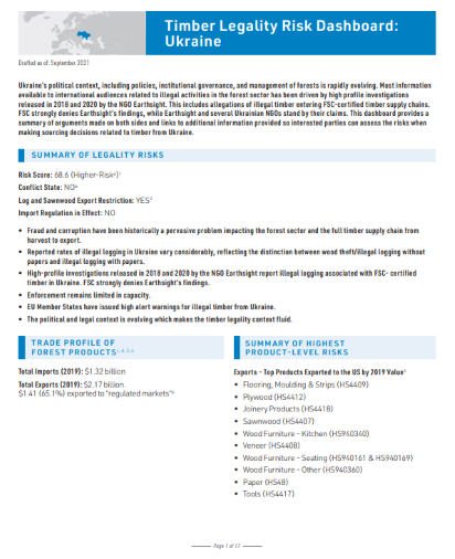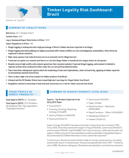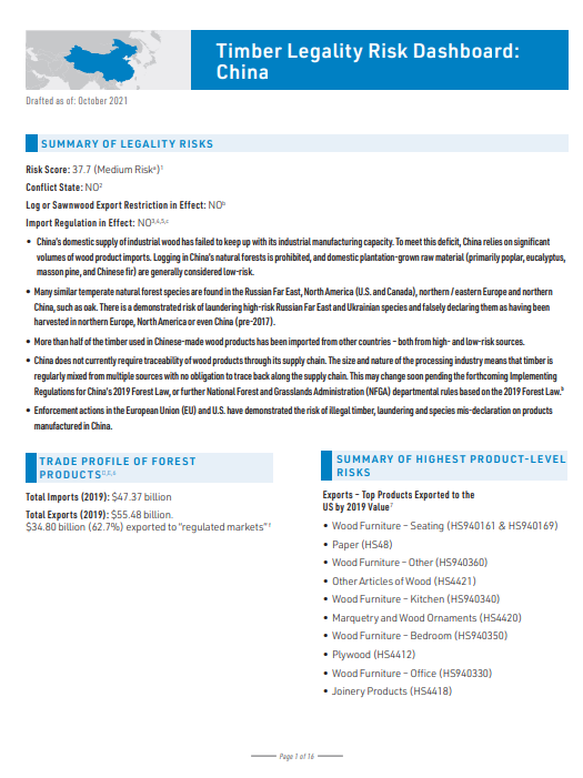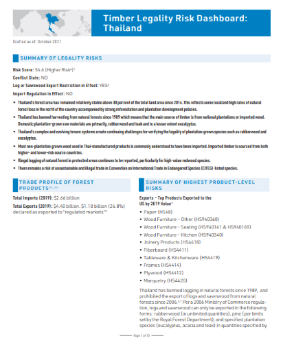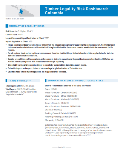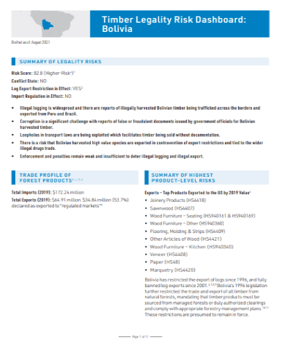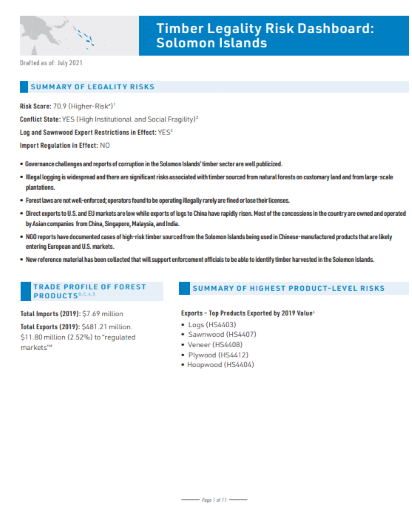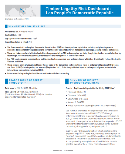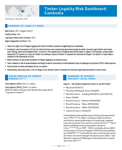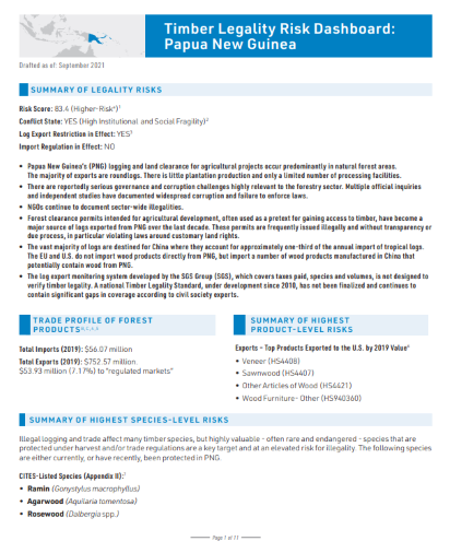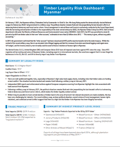 The Dashboards have been compiled from publicly available information sources to support risk assessments on the legality of timber products entering international supply chains. The Dashboards are for educational and informational purposes only. These Dashboards have been drafted with input from the Environmental Investigation Agency (EIA) and are subject to external peer review. The Dashboards will be updated periodically based on newly available information.