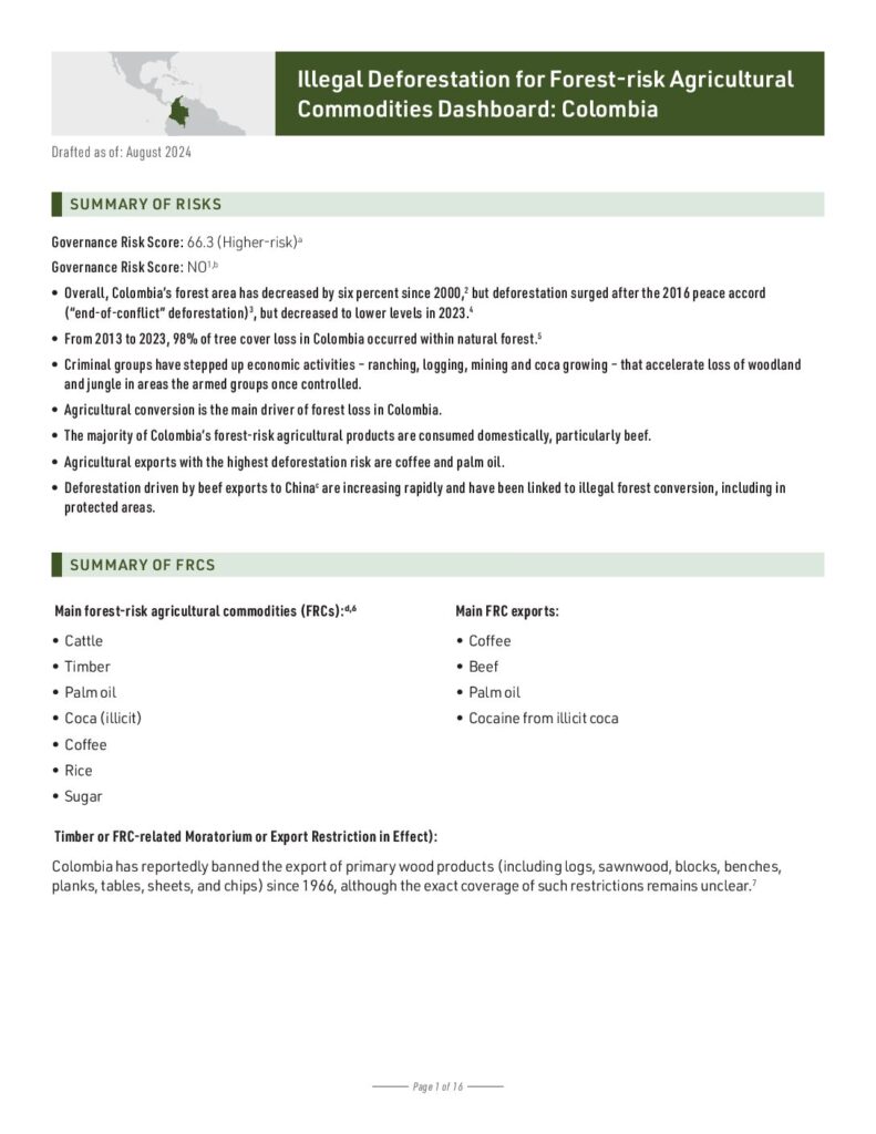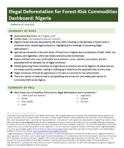 The FRC Dashboards build upon the framework developed for the Timber Legality Risk Country Dashboards. They have been compiled from publicly available information sources to support risk assessments on the legality of forest risk commodities entering international supply chains. The Dashboards are for educational and informational purposes only.