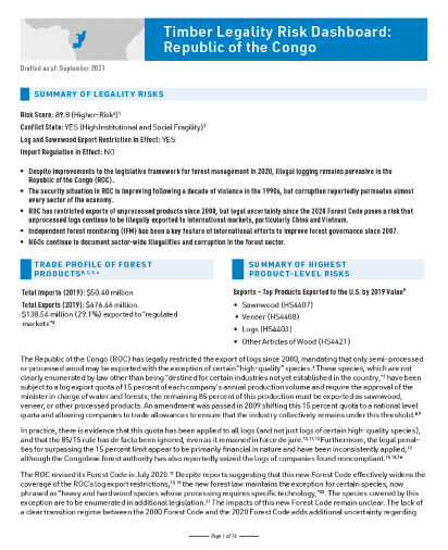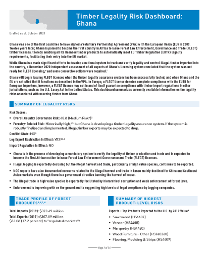 The Timber Legality Risk Country Dashboards (Dashboards) have been drafted by Forest Trends through a grant funded by the United States Department of State, Bureau of Oceans and International Environmental and Scientific Affairs. The opinions, findings, and conclusions stated herein are those of the authors and do not necessarily reflect those of the United States Department of State or any other party. The United States supports efforts to raise awareness of and combat global illegal logging and associated trade. These dashboards contribute to these ongoing efforts.