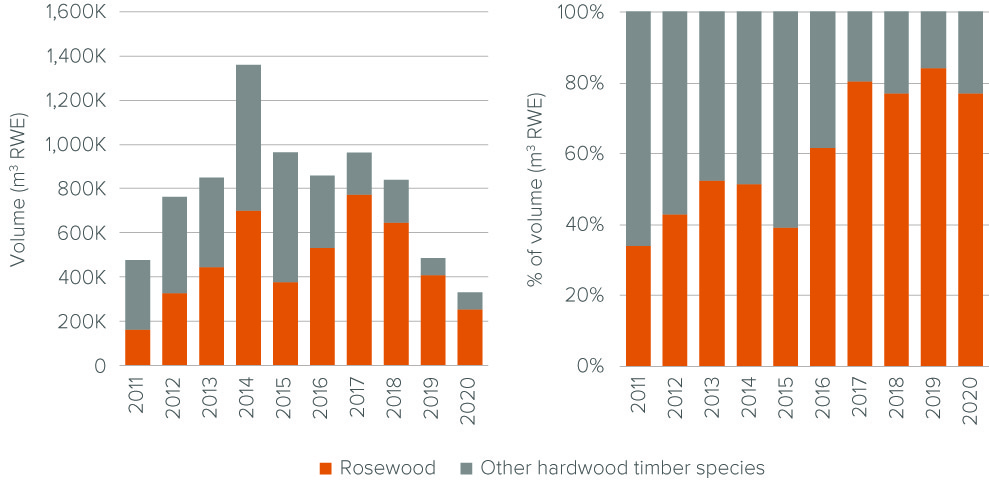 In January 2017, CITES listings regulating trade in many rosewood species took effect, including a genus-wide listing for Dalbergia and a listing for P. erinaceus. While overall Chinese imports have declined, China’s rosewood imports in 2017 actually rose compared to the previous year – demonstrating the limited effectiveness of the CITES listing. It was only in November 2018, when CITES issued a trade suspension of P. erinaceus from Nigeria,[5] that Chinese imports began to decline. Nigeria was then the largest supplier of rosewood globally and accounted for over 60% of China’s rosewood imports. An Environmental Investigation Agency (EIA) report revealed that the then-Environment Minister, who signed close to 3,000 CITES export permits, allowed traffickers to export an estimated $300 million worth of logs.[6] The trade suspension had immediate impact: China’s imports of Nigerian rosewood the next year fell by 30-fold, causing overall rosewood imports to drop more than 50%.