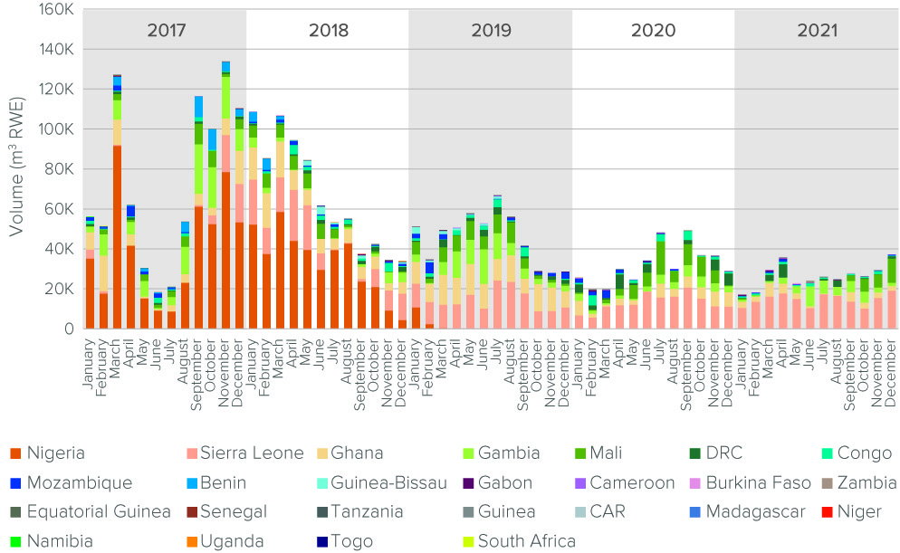 Figure 3: China’s monthly imports of hongmu logs and sawnwood from West Africa, by volume, January 2017 – December 2021