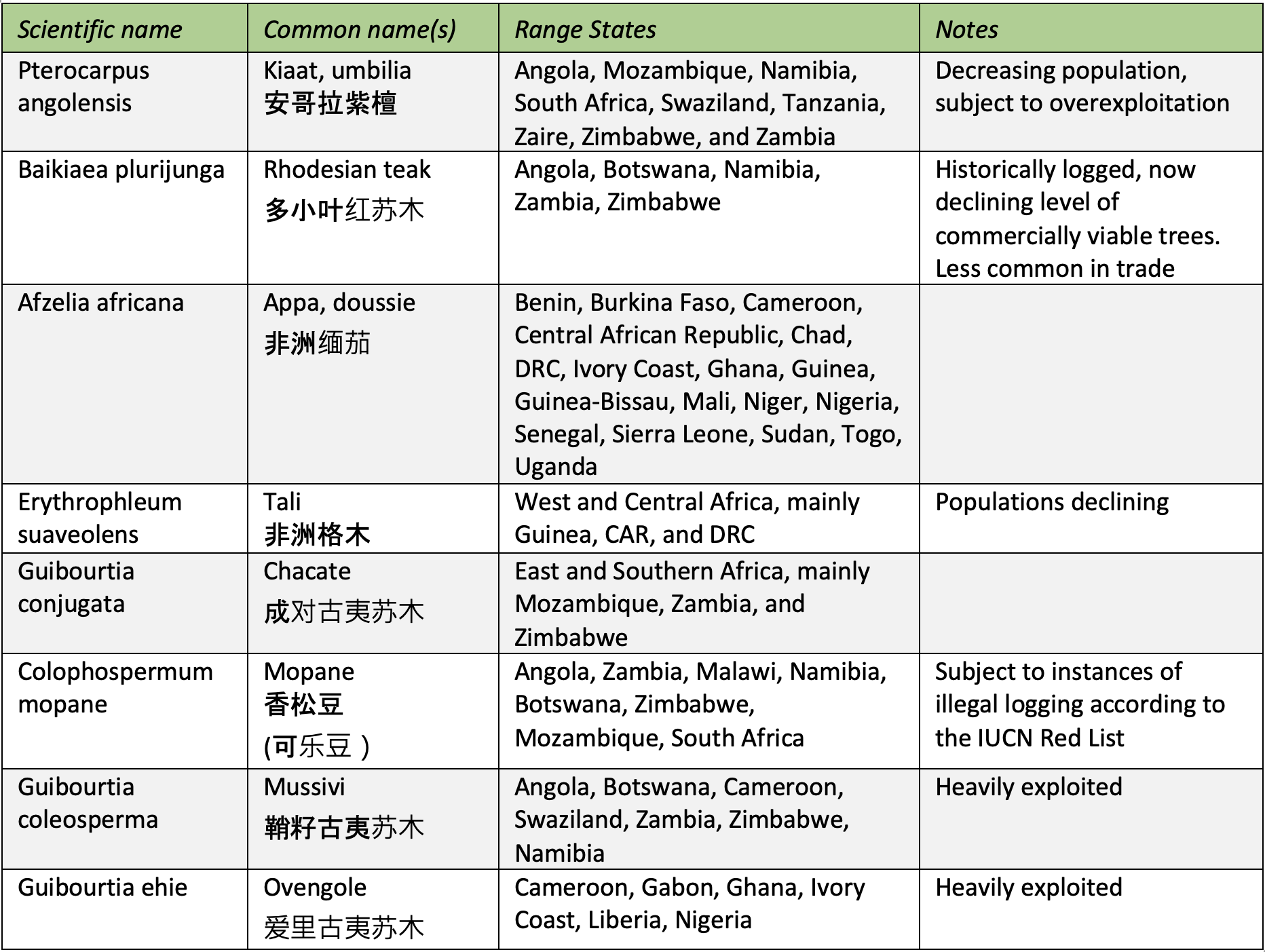 However, there remains risk that trade will simply continue unreported via smuggling or misdeclaration of logs as other, non-protected species. Parties to CITES should also be aware of other African tropical hardwood species that are already being identified as substitutes for kosso in Chinese markets, many of which are also being heavily exploited (Table 1). A genus listing for Pterocarpus will be submitted to the 19th CITES Conference of Parties (CoP) in November 2022, and there is some momentum for a Guibourtia genus listing (unlike listings of single species, genus listings are thought to be more comprehensive). But without widespread protection for all tropical hardwoods, there is a risk that lookalike species will be targeted. Traders claim that South American species may already also be substituting for African rosewood and China’s imports from the region are surging.