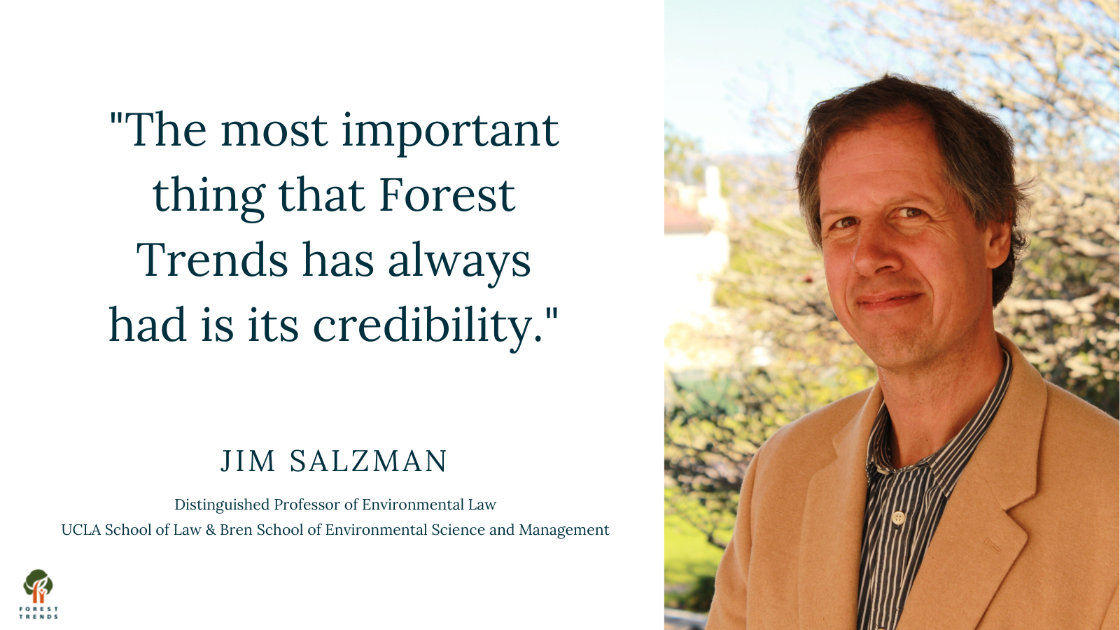 Jim Salzman is a distinguished professor of environmental law at the University of California, Los Angeles (UCLA) Law School and the Bren School of Environmental Science and Management, UC Santa Barbara with over 25 years of experience. One of the leading scholars in the field, he has written 12 books and over 100 articles and book chapters, covering topics from drinking water and ownership engineering to the legal and institutional issues in creating markets for ecosystem services. Jim has been partnering with Forest Trends on environmental markets research for over 20 years and is a Forest Trends Fellow.
