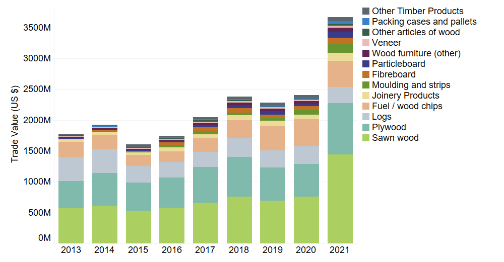 Russian exports of timber products to EU27+European Free Trade Association (EFTA) by trade value