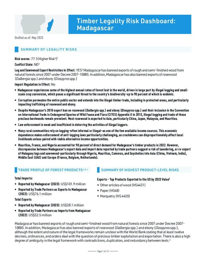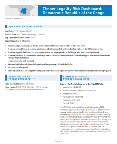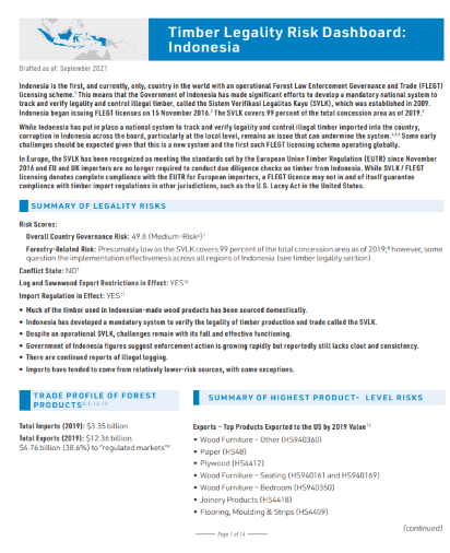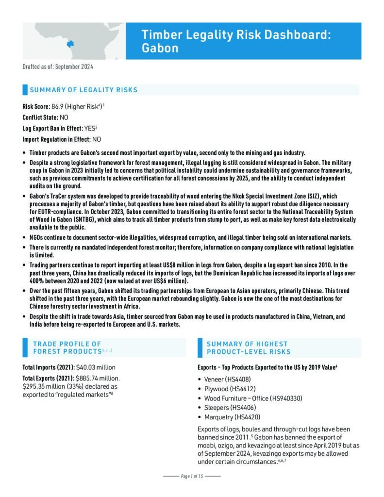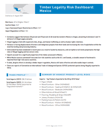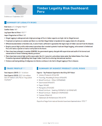 The Dashboards have been compiled from publicly available information sources to support risk assessments on the legality of timber products entering international supply chains. The Dashboards are for educational and informational purposes only. These Dashboards have been drafted with input from the Environmental Investigation Agency (EIA) and are subject to external peer review. The Dashboards will be updated periodically based on newly available information.