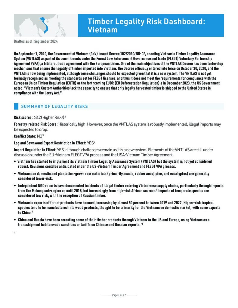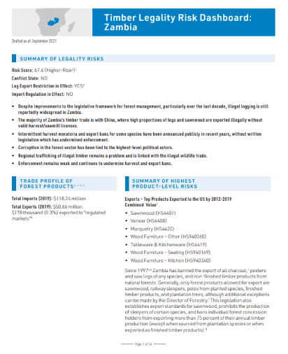 The Timber Legality Risk Country Dashboards (Dashboards) have been drafted by Forest Trends through a grant funded by the United States Department of State, Bureau of Oceans and International Environmental and Scientific Affairs. The opinions, findings, and conclusions stated herein are those of the authors and do not necessarily reflect those of the United States Department of State or any other party. The United States supports efforts to raise awareness of and combat global illegal logging and associated trade. These dashboards contribute to these ongoing efforts.