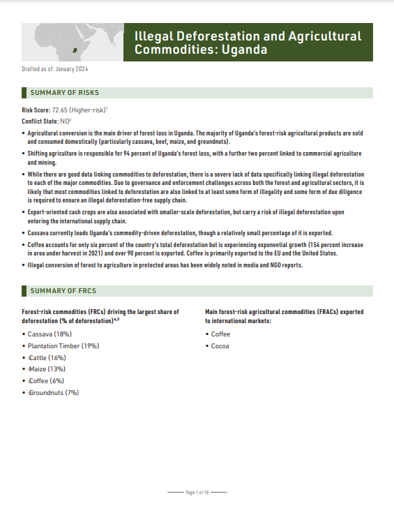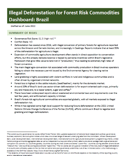 The FRC Dashboards build upon the framework developed for the Timber Legality Risk Country Dashboards. They have been compiled from publicly available information sources to support risk assessments on the legality of forest risk commodities entering international supply chains. The Dashboards are for educational and informational purposes only.