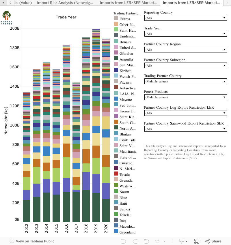 The charts contained on the ILAT Risk Data Tool tabs are interactive, allowing users to apply filters to examine specific trade flows and their potential risk of illegality. Data and charts can be downloaded from this website. We ask that you cite Forest Trends’ IDAT Risk website, as downloaded [date].