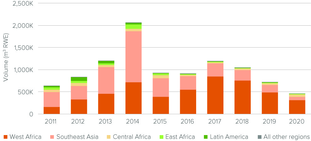 Figure 1: China’s imports of hongmu logs and sawnwood, by source region and volume, 2011-2020