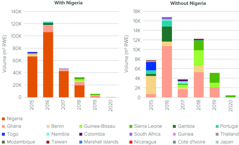 Figure 4: Vietnam’s imports of P. erinaceus, by volume and value, 2015-2020. Left: Nigeria; Right: all other supplier countries