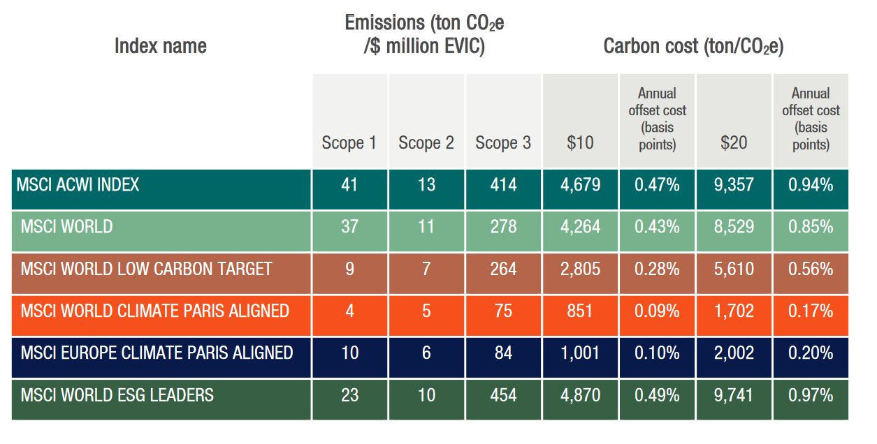Thus, based on what would currently be a high carbon credit price of $20 per ton of CO2e, the flagship MSCI ACWI Index would cost 0.94% per annum to offset, the World Low Carbon Target 0.56% and the World Climate Paris Aligned just 0.17%.
