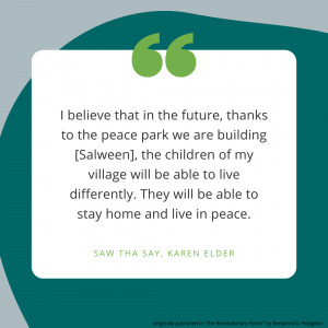Securing livelihoods and economic development on their own terms helps communities prevent the poverty often associated with displacement from their lands and abandonment of traditional practices. Karen peoples in Myanmar have been displaced by armed conflict for a generation, denied autonomy, and forced to flee violence. In 2018, they returned to a portion of their ancestral lands and established the Salween Peace Park. Within the Peace Park, the Karen have revived traditional governance systems, reintroduced agroforestry, and formed a committee to monitor their boundaries. The Park protects one of the region’s most important remaining biodiversity hotspots.[16]