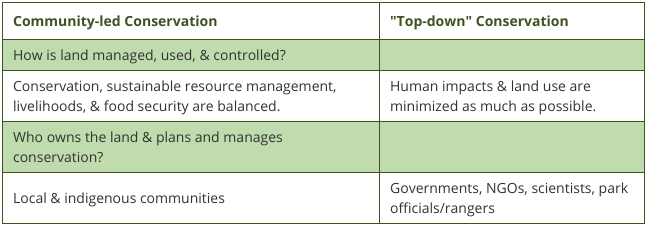 Community-led conservation, also known as “working lands” conservation, is when local or indigenous peoples sustainably manage a landscape to support both nature and people. In other words, they manage the land to produce food, fuel, timber, and other products, while maintaining habitat for wildlife. This style of management also sustains nutrient and water cycles, as well as ecosystem services such as pollination and carbon sequestration.[3] In this vision, conservation does not have to come at the cost of communities’ presence on the land or their livelihoods.