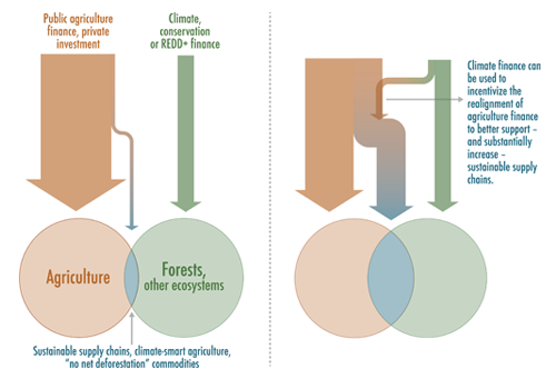 REDD+ funds are limited, but agricultural finance pools are quite large. Integrating these pools of finance can help catalyze substantial additional finance flowing into sustainable agriculture that conserves forests.